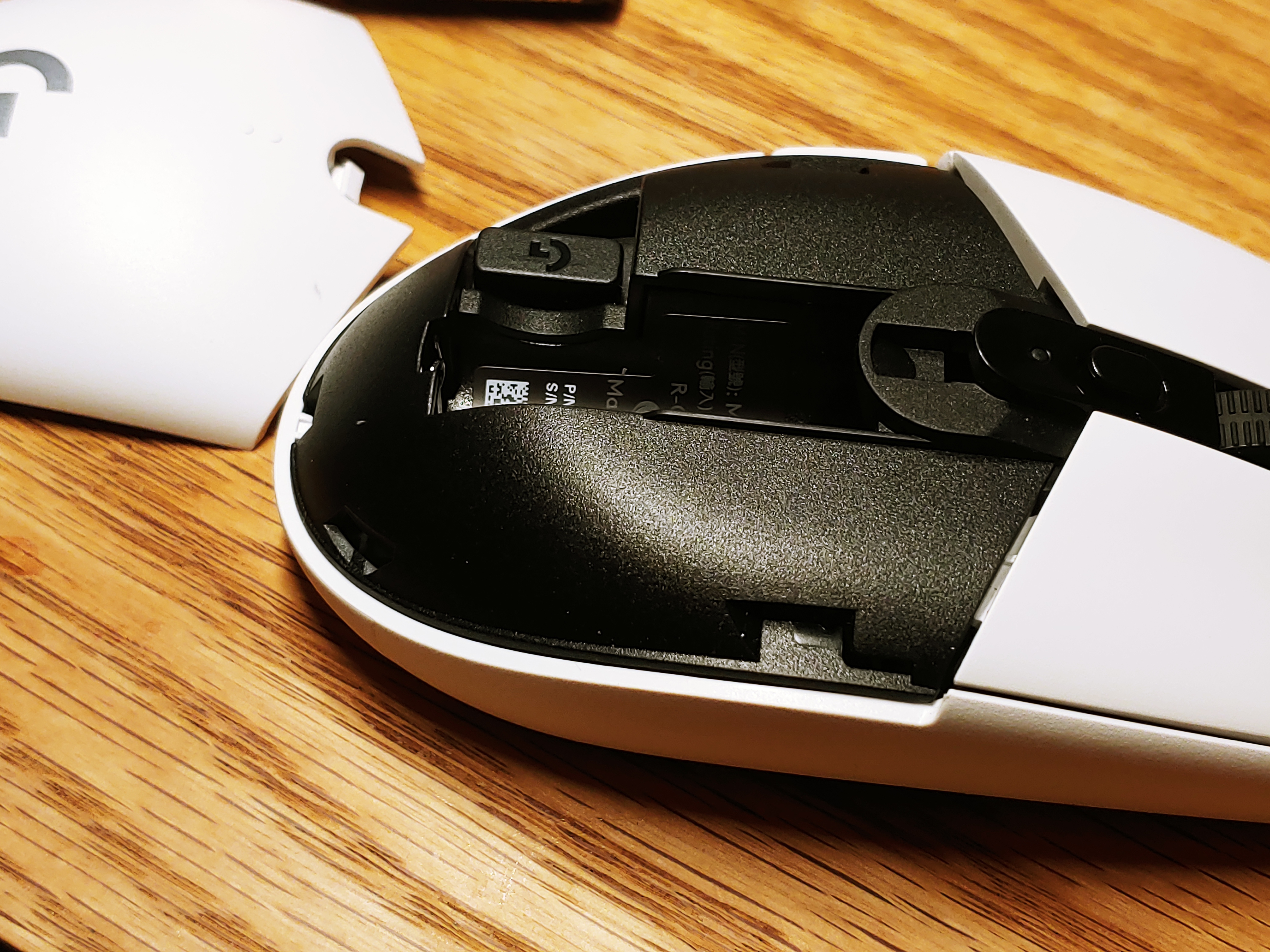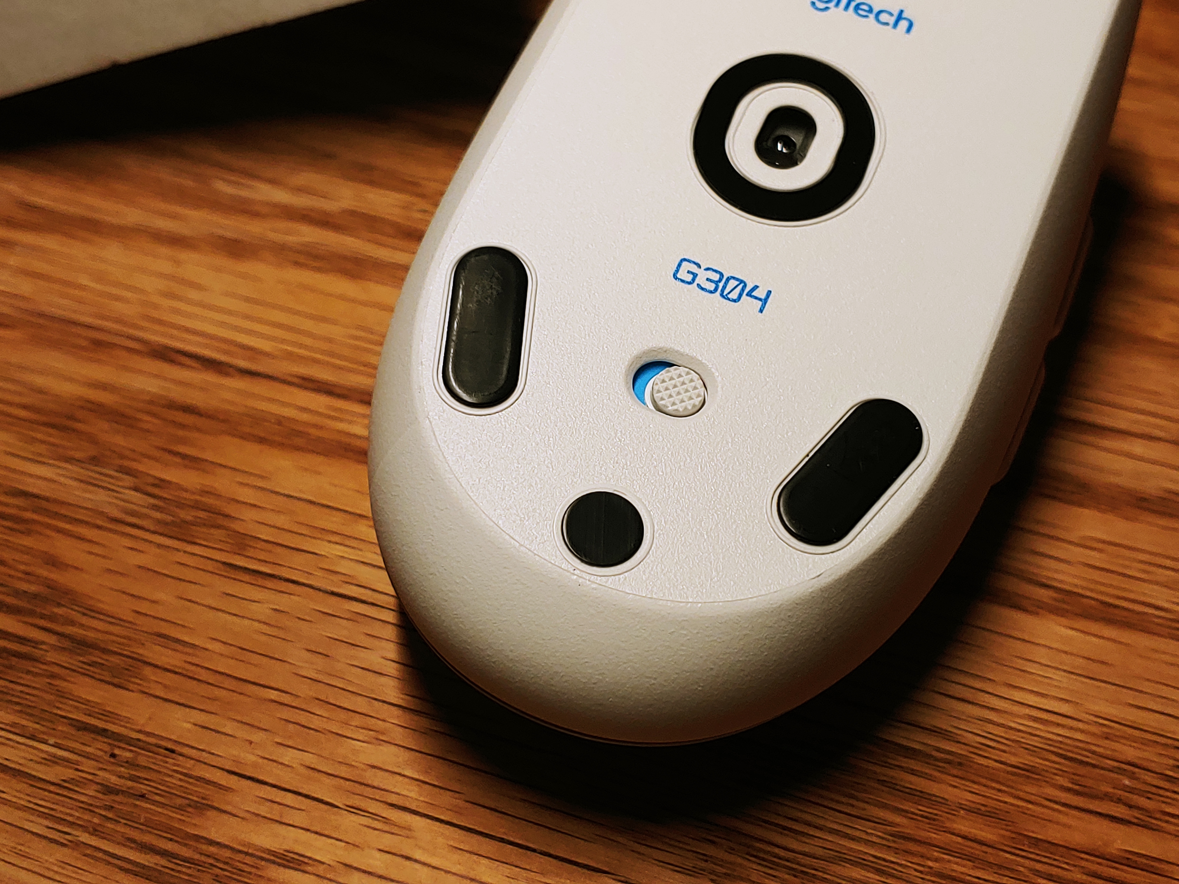 일단 마우스 바닥을 보면 저렇게 사용하지 않을 때 전원을 차단할 수 있는 스위치가 있다. 스위치 왼쪽의 하늘색 바닥이 보이는 상태가 전원이 켜진 상태, 저 스위치를 왼쪽으로 밀면 연한 붉은색 바닥이 보이는데 그 상태가 전원을 끈 상태다. 어디선가 본 정보에는 이 G304의 짝퉁제품이 있다고 하는데 짝퉁제품의 경우 스위치를 움직여도 바닥 색상이 변하는거 없다고 한다.